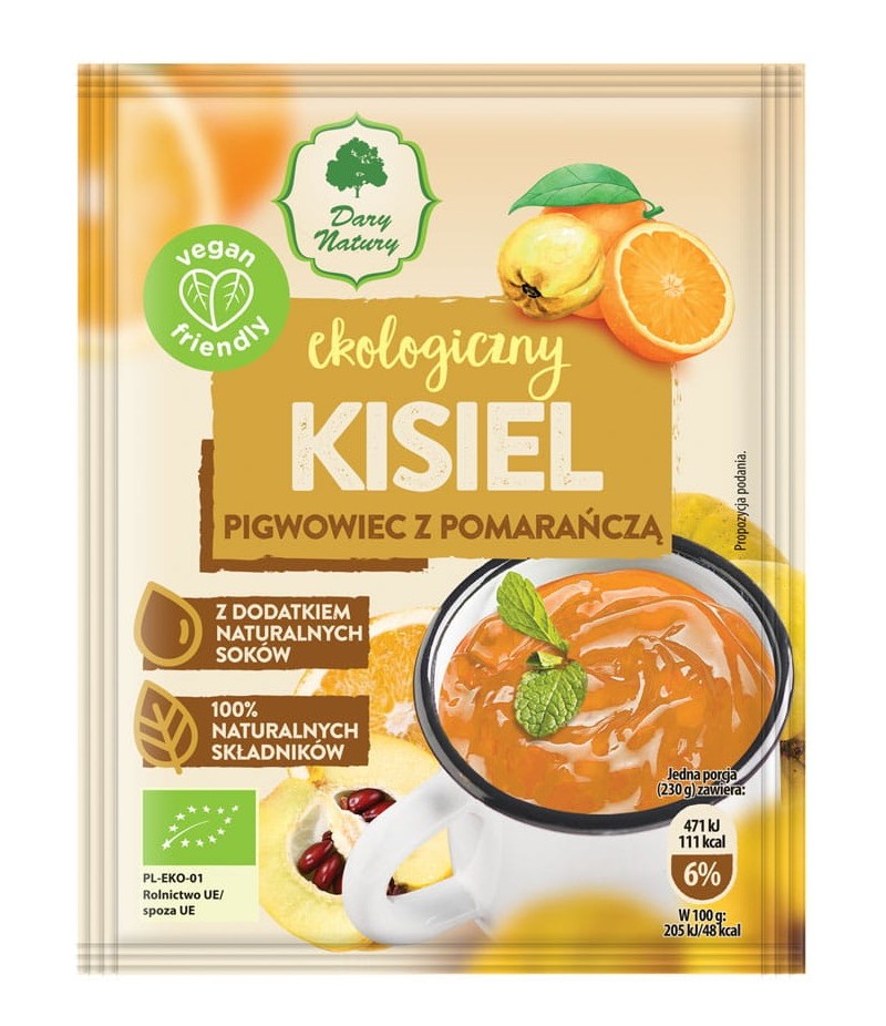 Ekologiczny kisiel pigwowiec z pomarańczą, z dodatkiem naturalnych soków i w 100 % z naturalnych składników. Pyszna przekąska do szybkiego i łatwego przygotowania w kubku.