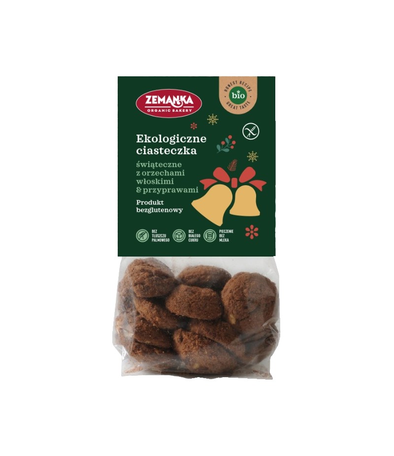 mąka gryczana*, nieutwardzony tłuszcz roślinny* (olej słonecznikowy*, tłuszcz kakaowy*, woda, emulgator: lecytyny (ze słonecznika*), regulator kwasowości: kwas cytrynowy), nierafinowany cukier trzcinowy*, JAJA*, mąka kukurydziana*, ciemna czekolada* (miazga kakaowa*, cukier trzcinowy*, tłuszcz kakaowy* - masa kakaowa min. 60 %, aromat waniliowy*), ORZECHY WŁOSKIE* 7,3 %, kakao*, aromat waniliowy*, mielony cynamon* 0,4 %, goździki* 0,2 %. (*certyfikowany składnik ekologiczny)
