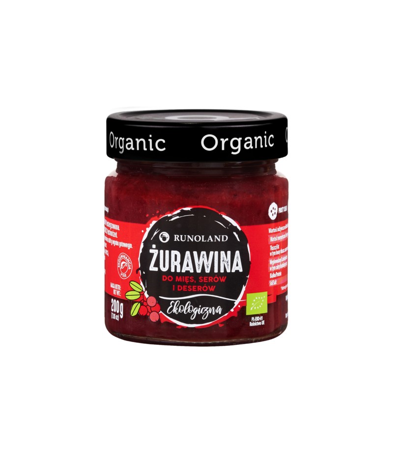 żurawina* (Oxycoccus quadripetalus) 80 %, cukier trzcinowy*, substancja zagęszczająca: pektyna, sok z cytryny*. (*certyfikowany składnik ekologiczny)
