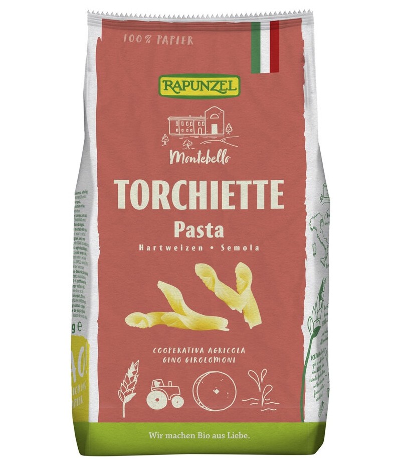 Organiczny makaron Semola Torchiette firmy Rapunzel wytwarzany jest z semoliny z PSZENICY durum. Powolny i delikatny proces suszenia w niskich temperaturach zapewnia charakterystyczny smak i konsystencję „al dente”. Delektuj się makaronem z ulubionym sosem!