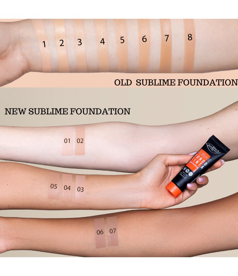 Organiczny podkład Sublime puroBIO zawiera naturalne pigmenty, jest bez silikonów, zawiera 20% ekstrakt z aloesu, skwalan pozyskiwany z oliwy z oliwek, o właściwościach biomimetycznych zapewniających wtapianie się podkładu w skórę i krzemionkę wchłaniającą sebum.