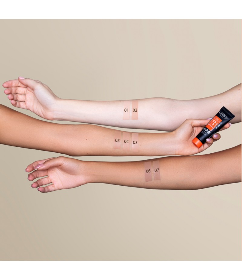 W zależności od potrzeb możliwe i / lub zalecane jest wcześniejsze nałożenie bazy w pudrze Primer puroBIO i / lub utrwalenie i zmatowienie za pomocą pudru puroBIO po nałożeniu podkładu.