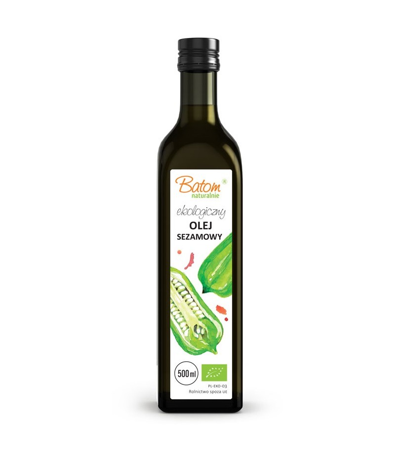 Olej sezamowy otrzymywany w procesie tłoczenia na zimno ekologicznych nasion sezamu.